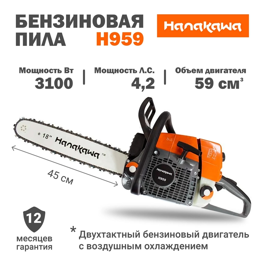 Бензопила цепная HANAKAWA H959 предназначена для спиливания ветвей, распила древесины, валки небольших деревьев, кустарников. Пила бензиновая оснащена регулируемой автоматической системой подачи масла на шину и цепь. Для полного контроля над инструментом бензопила бензиновая предусмотрена удобная дополнительная рукоятка. Для повышения безопасности в данной модели пилы имеется механический инерционный тормоз. Цепная пила бензиновая Hanakawa имеет небольшой вес, что позволяет использовать инструмент дольше без нагрузки на руки и спину. Садовый инструмент имеет продуманную конструкцию, пила для сада 959H является отличным выбором для различных целей, высокое качество по более доступной цене. Легкий и быстрый запуск двигателя делает строительный инструмент еще более удобным в использовании. Садовая пила имеет длину реза 45 см. Бензо пила это хороший подарок мужу отцу брату дедушке, мужской подарок на новый год день рождения 23 февраля. Гарантия на инструмент 1 год!