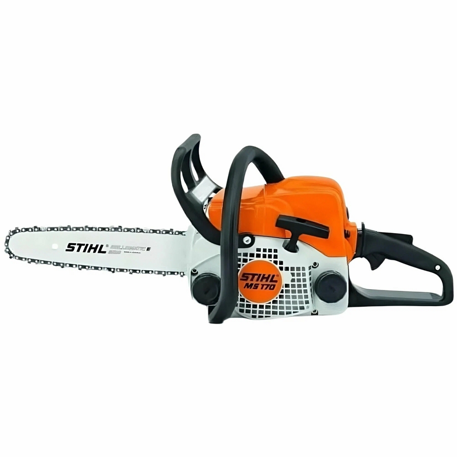 Stihl MS — 170 очень легкая и маневренная бензопила. Для удобной работы в быту модель поставляется с облегченной сварной шиной Rollomatic E Mini длиной 14 дюймов (35 см) и низкопрофильной цепью PMM (Picco Micro Mini). Данная цепь отличается высоким качеством реза и низкой вибрацией. Конструкция шины и цепи позволяет максимально качественно смазывать пильную гарнитуру во время работы, масло подается на участки, сильно подверженные износу.