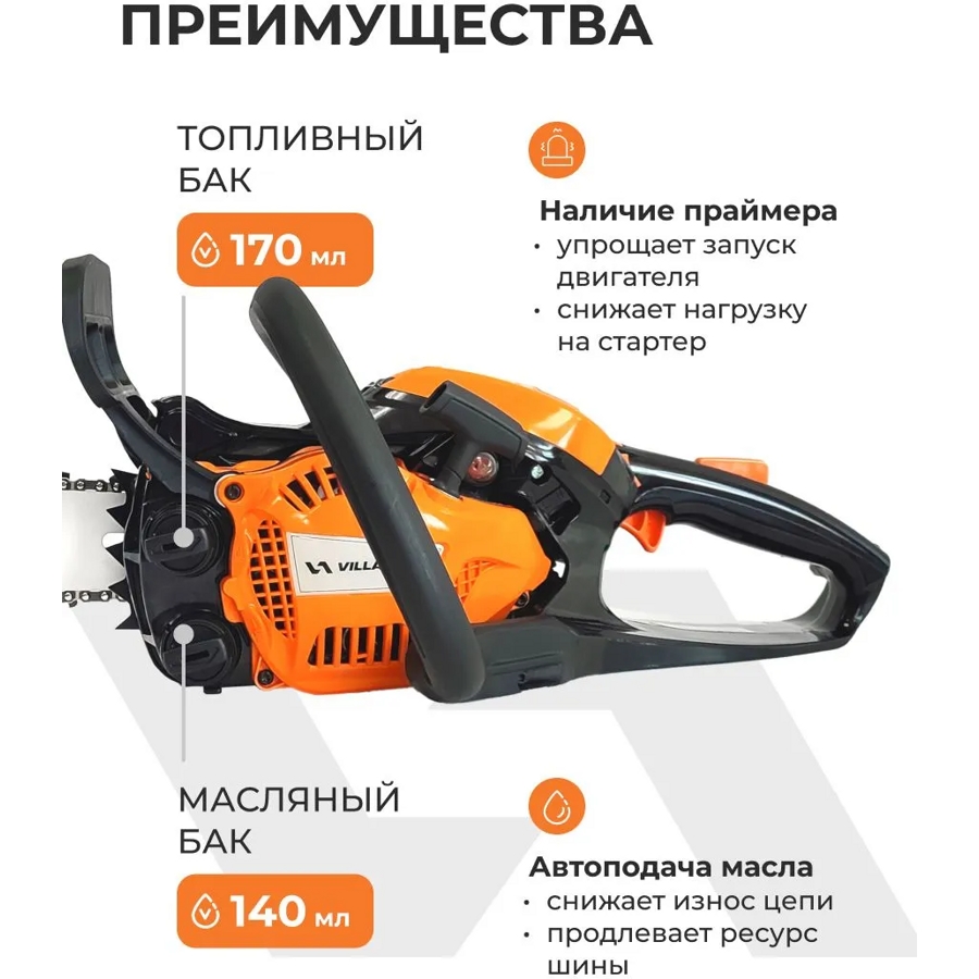 Бензиновая цепная пила VILLARTEC SB 1261 - удобный и лёгкий инструмент с мощностью 1,2 лошадиных сил, идеальный для бытового использования. Отлично подходит для распиловки дров, досок, брусков и спила деревьев. Вес без шины и цепи всего 2,7 кг, что делает работу легкой и быстрой.