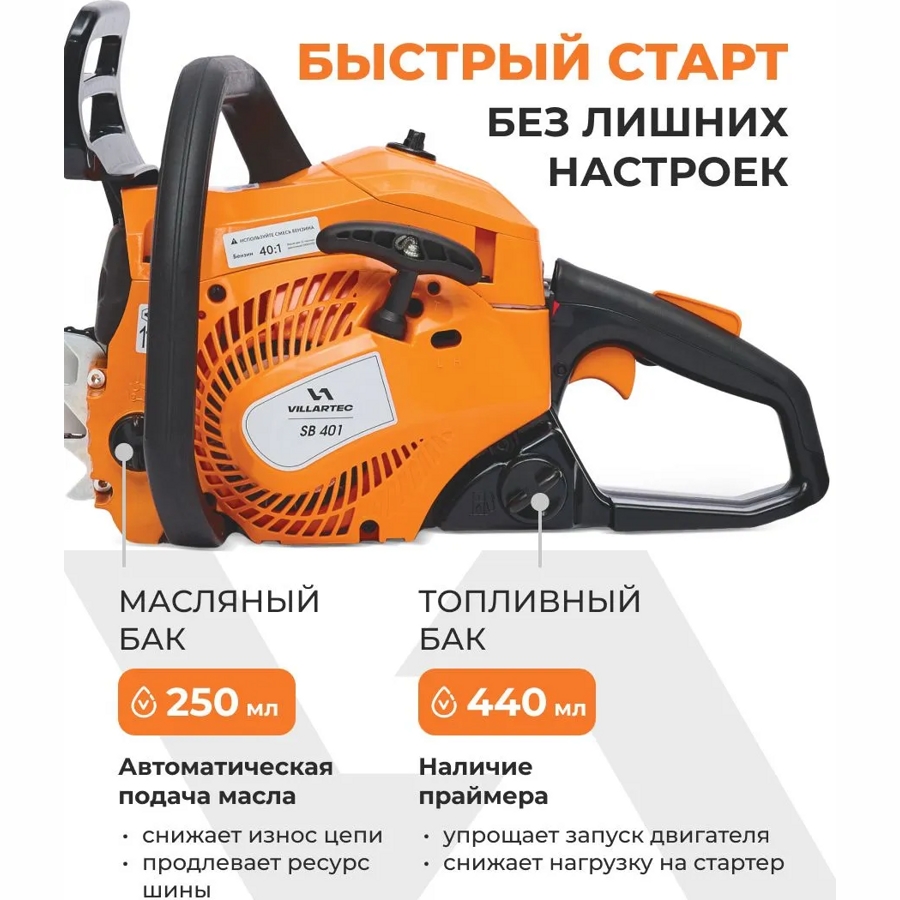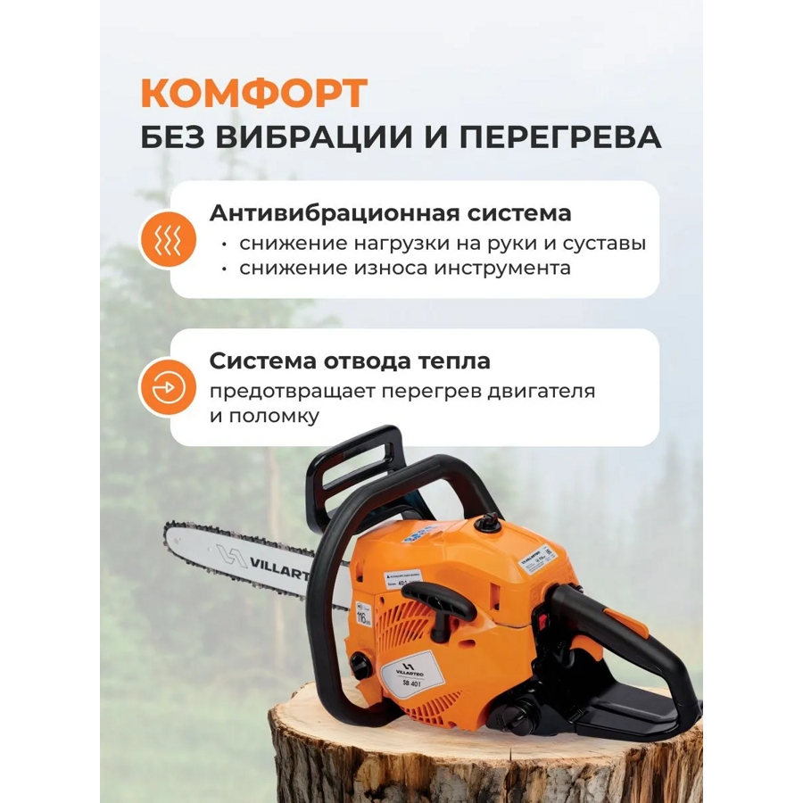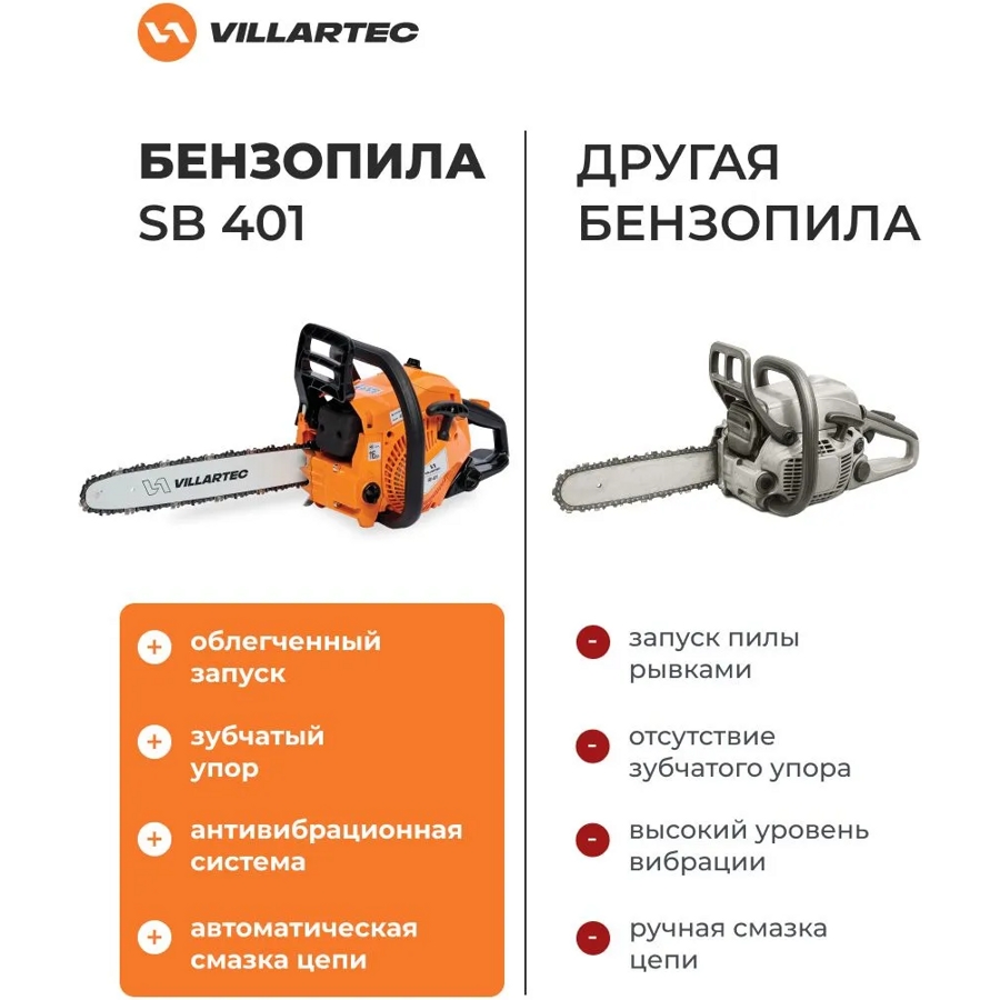 Бензиновая цепная пила VILLARTEC SB 401 - идеальный инструмент для работы с высокими требованиями к производительности. Она отлично справляется с большими нагрузками без потери оборотов двигателя.