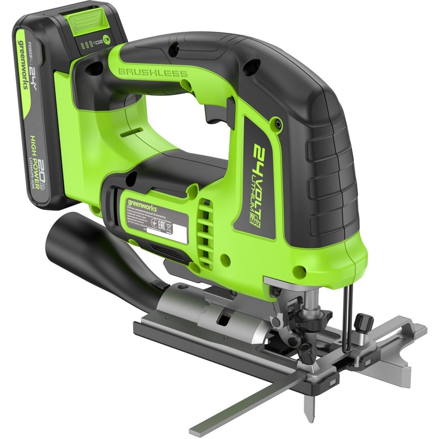 Лобзик аккумуляторный Greenworks 24V GD24JS (арт.3601407CUB) - легкий (всего 1,68 кг.) и компактный инструмент с маятниковым механизмом. Бесщеточный двигатель гарантирует долговечность работы устройства.