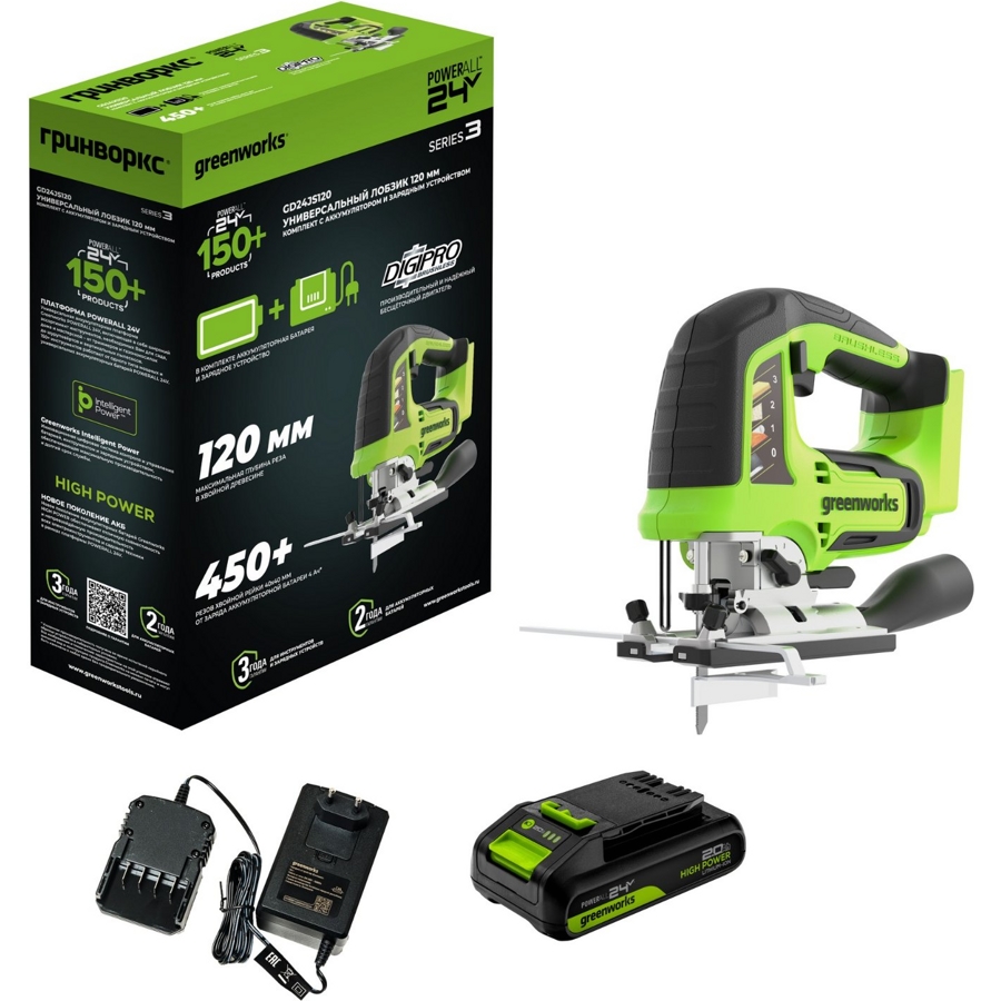 Максимальная глубина реза в древесине - 100 мм, а в нелегированной стали - 8 мм. Полотно имеет быстро зажимной бесключевой фиксатор для легкой и быстрой замены полотен. Данная модель работает от аккумулятора 24V, который мощнее стандартного аккумулятора 18V на 30%. К тому же, применяемый аккумулятор совместим с более чем 70-ю устройствами из серии Greenworks G-24V.
