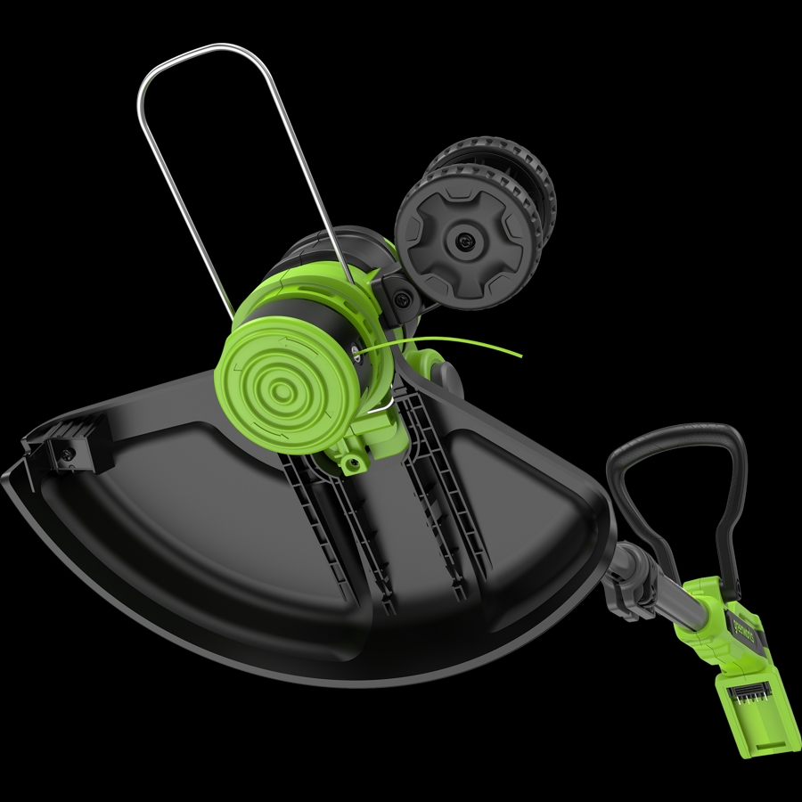D-образная рукоятка триммера регулируется по углу наклона и удобна для маневра в условиях ограниченного пространства. Подача лески осуществляется автоматически при включении триммера, никаких действий производить не нужно. Скоба, установленная рядом с триммерной головкой, защитит окружающие предметы от контакта с леской.