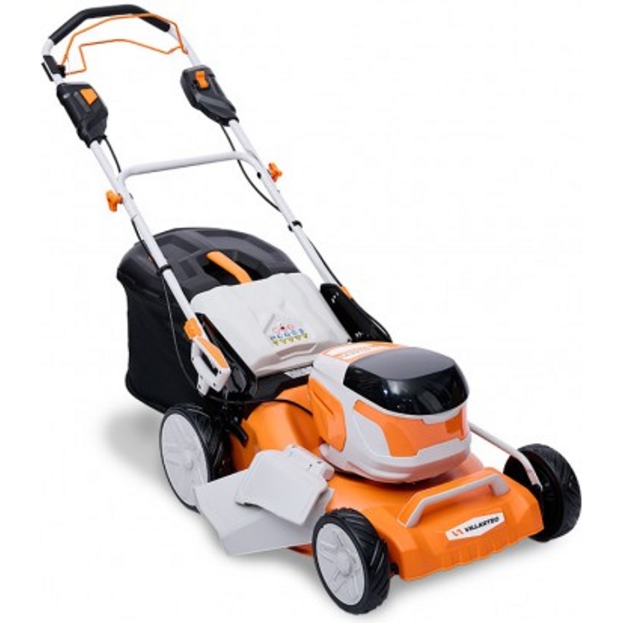 Газонокосилка работает от аккумуляторной батареи напряжением 40 В. Имеет центральную регулировку высоты скашивания с пятью положениями в диапазоне от 25 до 80 мм и значительную ширину скашивания 46 см.